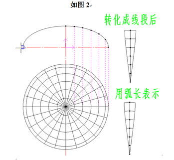⑸ 在所作的若干圓上截取相應(yīng)的同心圓弧的長(zhǎng)度,為了下料方便,把弧長(zhǎng)轉(zhuǎn)化成線段的長(zhǎng)度,按順序分別添加到素線的等分點(diǎn)上,如圖2。